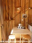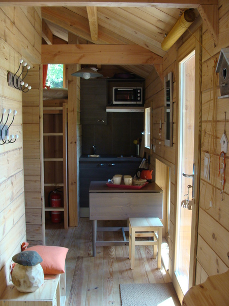 Petite cabanette de jeux attenante sur la terrasse pour les petits. Salle de bains avec douche antiglisse et WC intégrés à la cabane, ainsi qu'une kitchenette équipée. Accueil couple ou 2 adultes et 2 enfants.