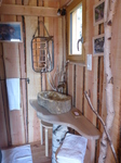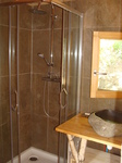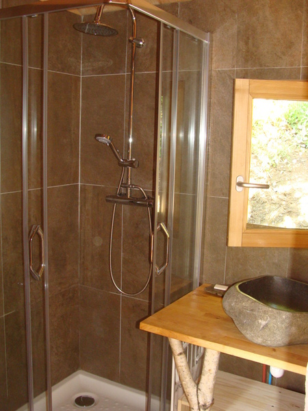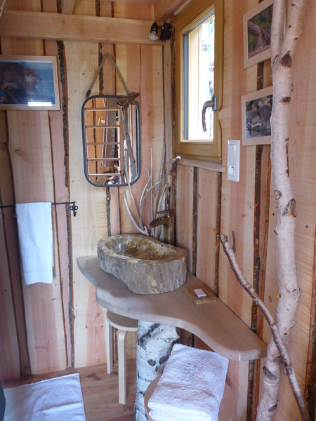 Salle de bains avec douche antiglisse et WC intégrés à la cabane, ainsi qu'une kitchenette équipée. Accueil couple ou 2 adultes et 3 enfants.