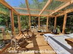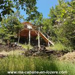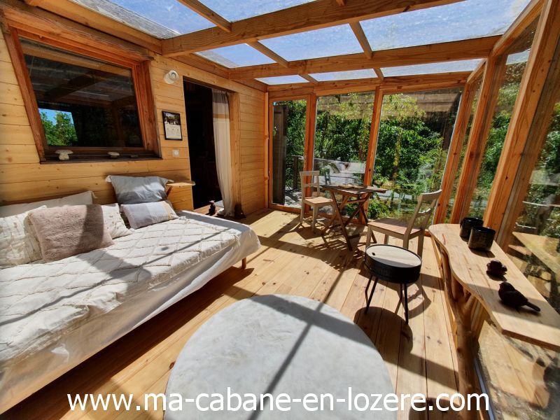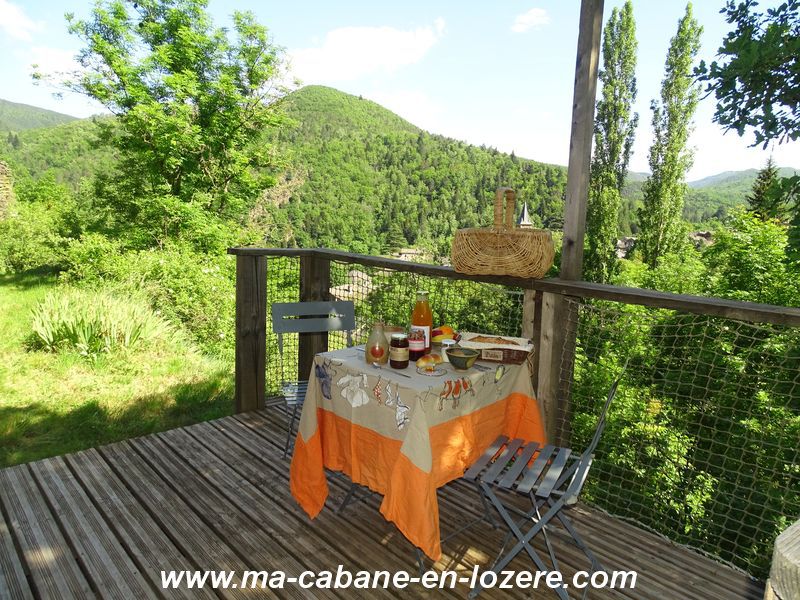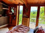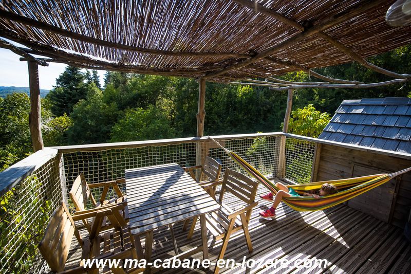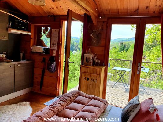 Cabane grand confort décorée avec soin, avec jardin et Spa à jet privatif illimité en option sur réservation avec très belle vue panoramique, ainsi qu'une terrasse qui s'avance au dessus du vide.