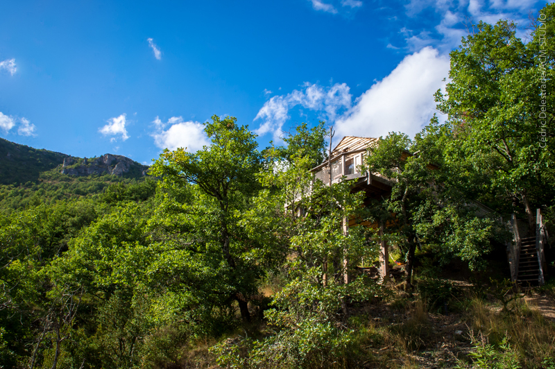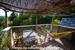 La terrasse est suspendue à 5m de haut, sur pilotis. L'accès se fait par un sentier dans la montagne et plusieurs escaliers pour monter dans la cabane.