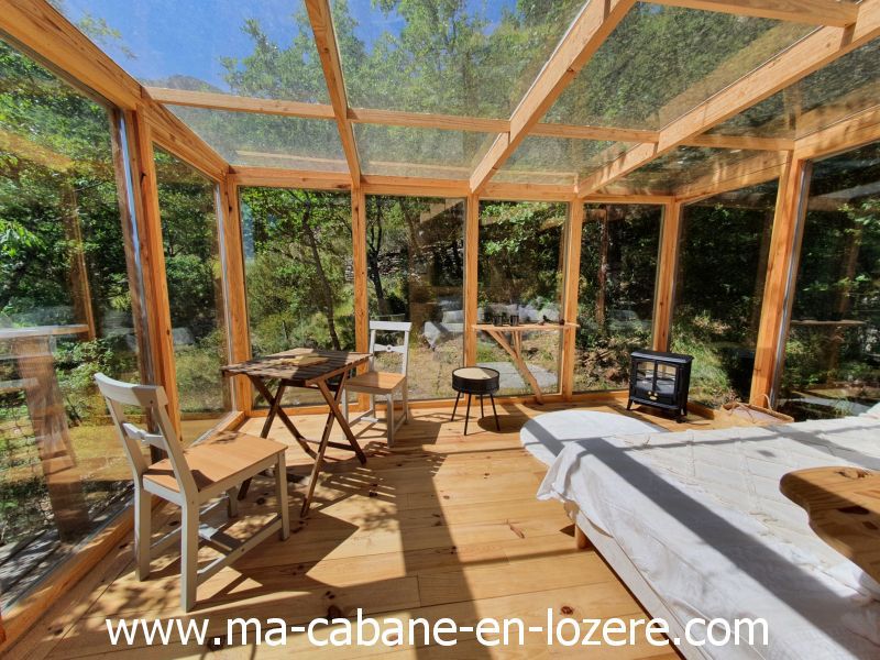 Sa terrasse suspendue offre une vue à couper le souffle. Cabane grand confort, isolée et chauffée. Salle de bains et WC intégrés à la cabane ainsi qu'une kitchenette équipée. Observatoire du ciel vitré intégré à la cabane avec vue panoramique et matériel d'observation.