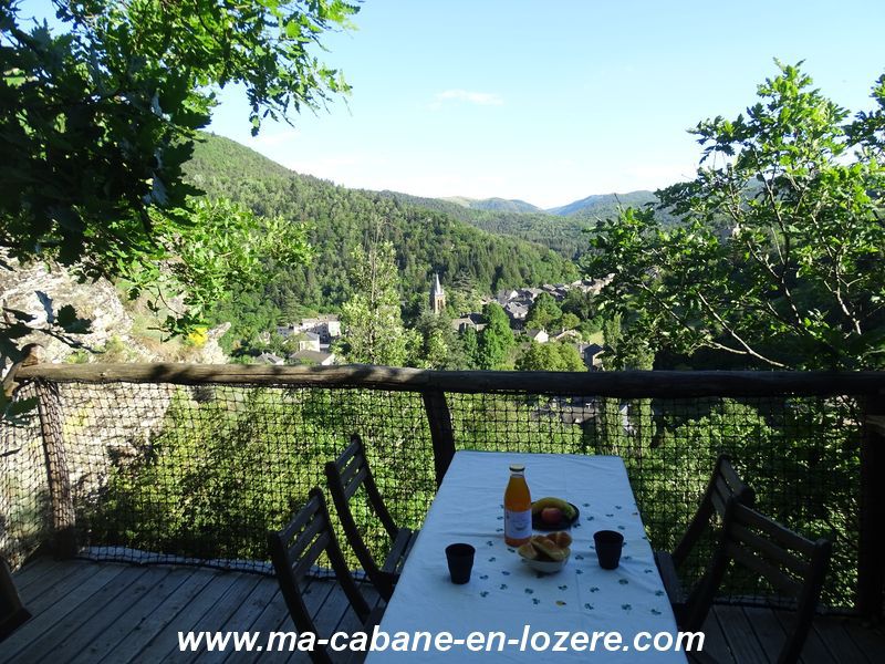 Très belle vue panoramique depuis la terrasse qui s'avance au dessus de la végétation sur la nature et les falaises du Causses Méjean.