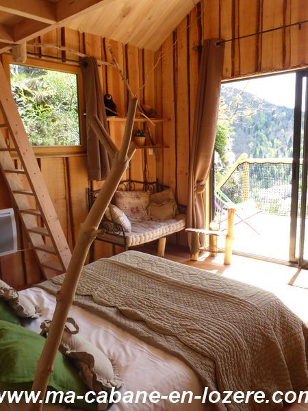 Cabane en l'air à environ 2m50 avec terrasse et mobilier pour les repas et hamac. Cabane de charme tout confort, isolée, chauffée et décorée avec soin. Une très belle vue en panorama sur la vallée et la nature et vue sur le bassin. A proximité de la piscine LAvogne en pierre.